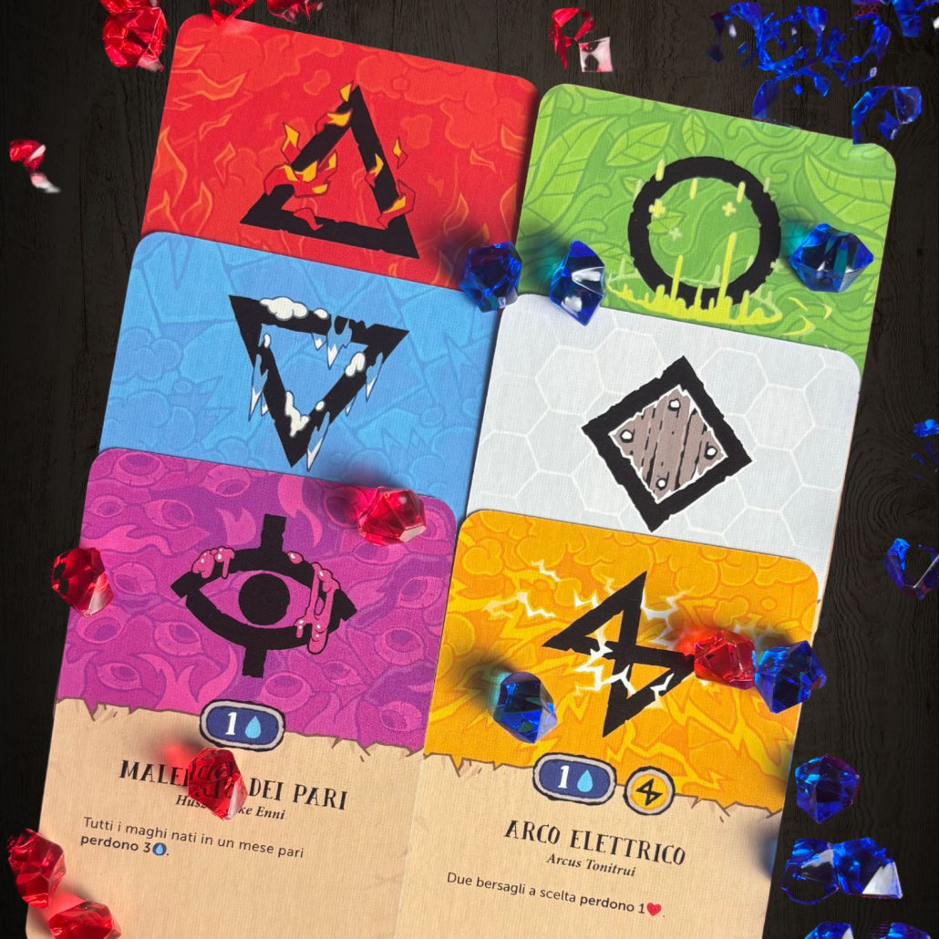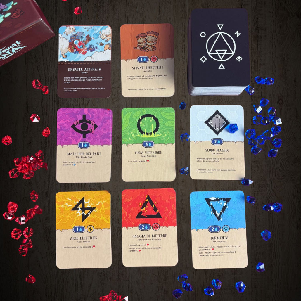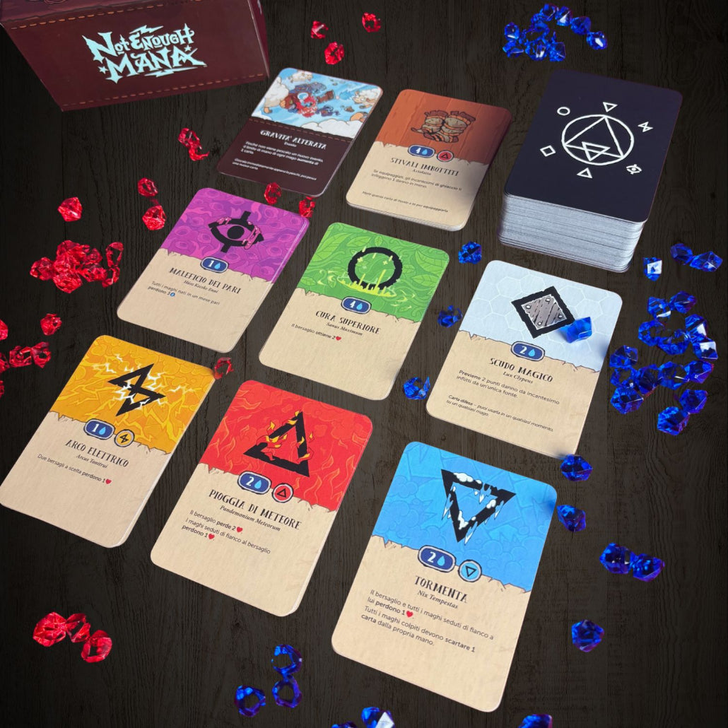 Not Enough Mana è un drinking card game di pozioni per 3-6 maghe e maghi temerari. Preparatevi a massacrarvi a colpi di incantesimi epici, malefici devastanti e artefatti arcani, mentre recupererete il vostro mana bevendo pozioni (l’età legale per l’assunzione di pozioni potrebbe variare a seconda delle leggi del vostro regno).
